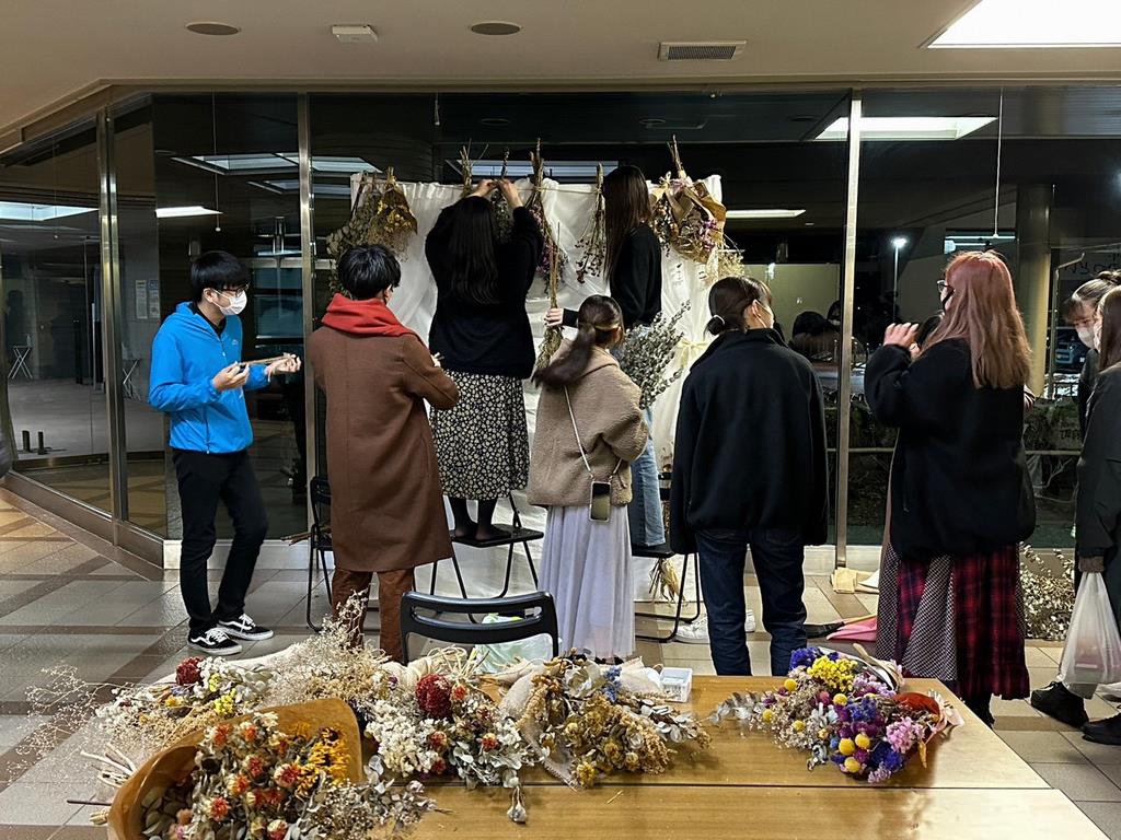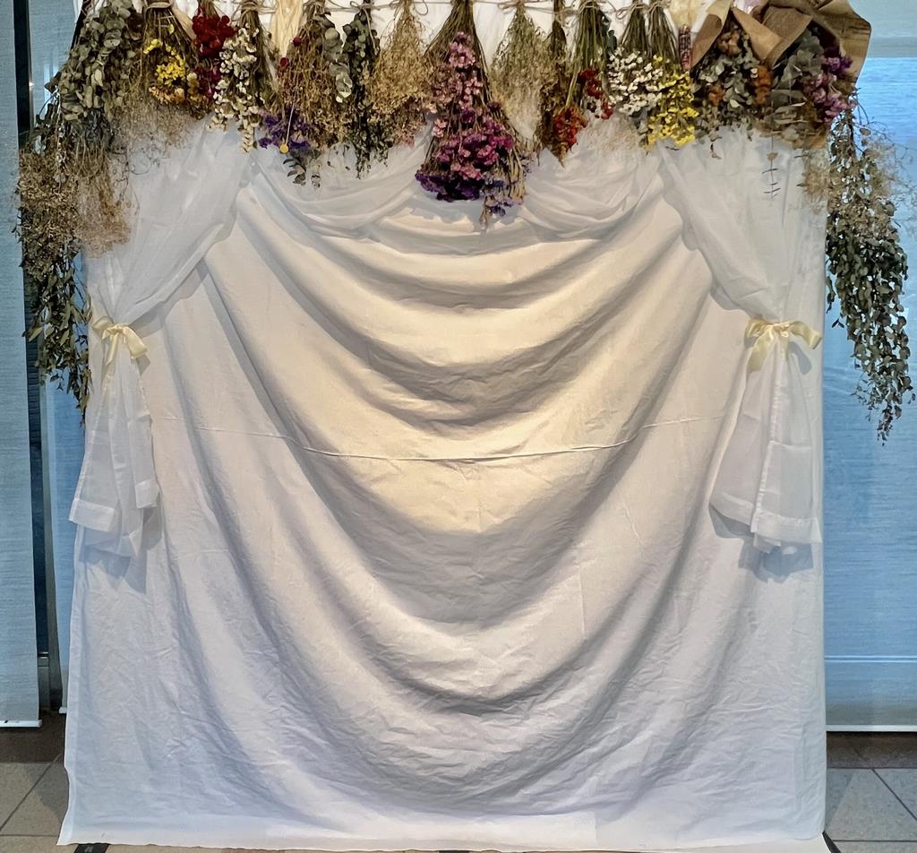 吊るしているドライフラワーのブーケは、メンバーの手作りです!