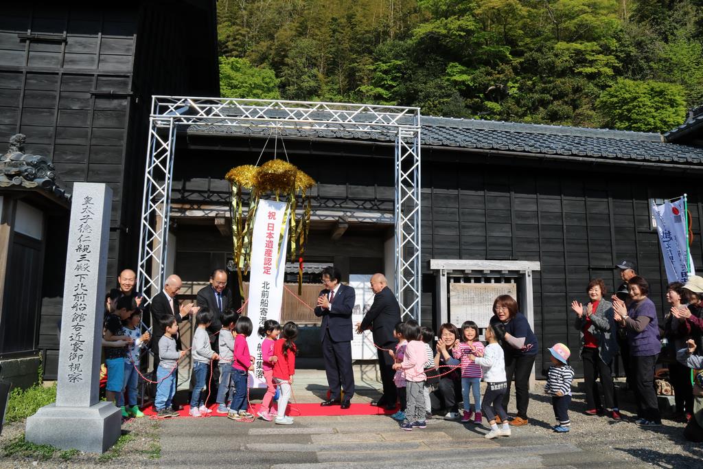 日本遺産の認定を記念して、4月28日(金曜日)15時30分から「北前船主の館 右近家」で敦賀市と合同セレモニーを行いました。会場には地元の方など約150名が集まり、地元河野保育園の園児たちの歌が披露されるなど認定をお祝いました。
