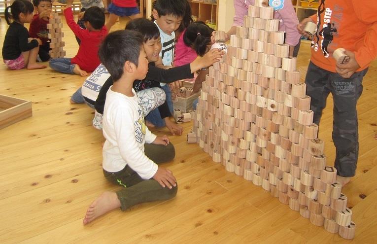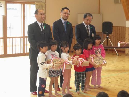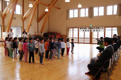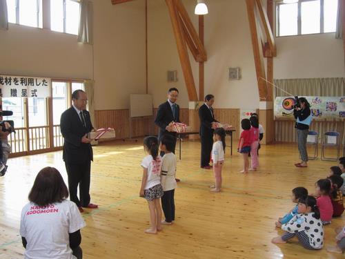 平成29年5月11日、南条こども園で、楽天の森の間伐作業で発生した木材を使って作られた積み木の贈呈式があり、湯尾保育所、河野保育園、今庄なないろこども園にも贈られました。
